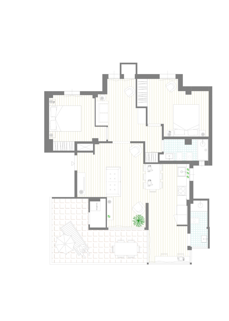 - ampia terrazza di 25 mq parzialmente ombreggiata con tendone, con zona pranzo e lettini prendisole
